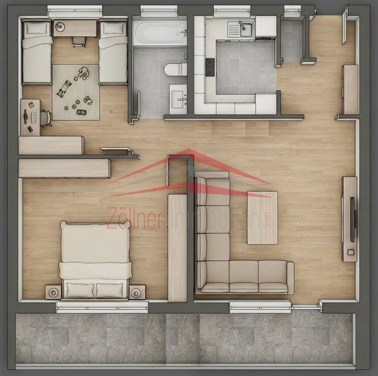 Über den Flur sind alle Räume bequem erreichbar. Das Wohnzimmer bietet ausreichend Platz für einen Wohn- und Essbereich und verfügt über den Zugang zum großen Balkon, der zum Entspannen einlädt. Die Küche ist mit einer Einbauküche inklusive Elektrogeräten ausgestattet und funktional geschnitten. Ein Schlafzimmer sowie ein weiteres Zimmer, nutzbar als Kinder-, Gäste- oder Arbeitszimmer, runden das Raumangebot ab.