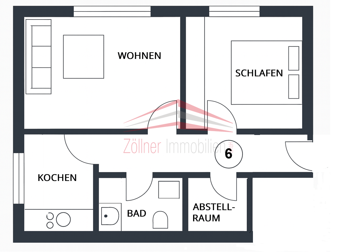 Die Raumaufteilung umfasst ein Wohnzimmer, ein Schlafzimmer, ein Innenbad mit Dusche, WC, Waschbecken und einem Waschmaschinenanschluss, sowie einen praktischen Abstellraum in der Wohnung.