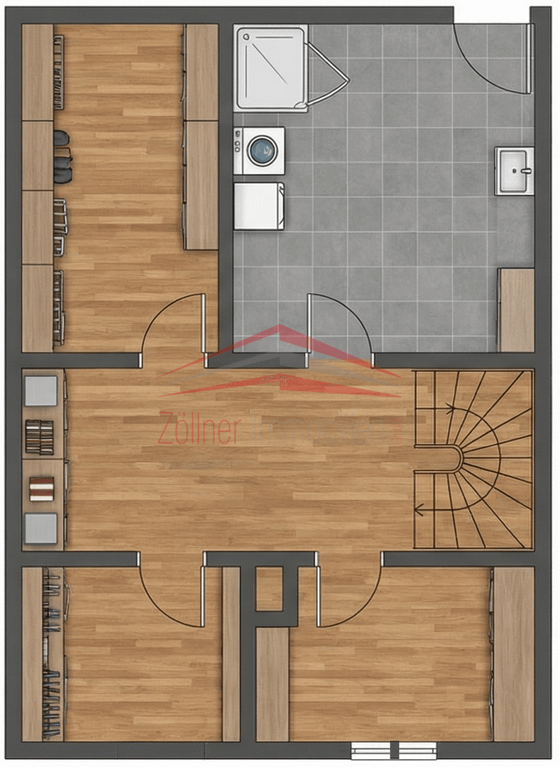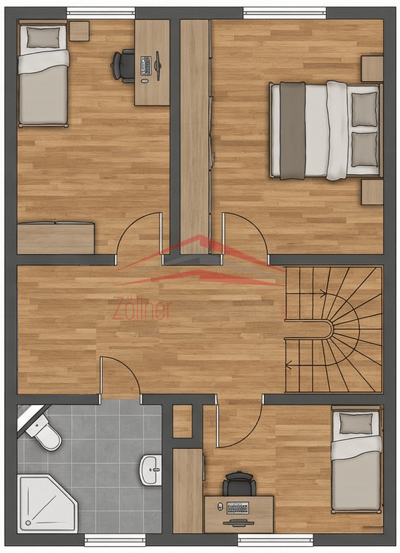 Das Obergeschoss verfügt über insgesamt drei Schlafzimmer, die flexibel als Schlaf-, Kinder- oder Arbeitszimmer genutzt werden können. Modernes Tageslichtbad mit Fenster, Dusche, Waschbecken und WC.