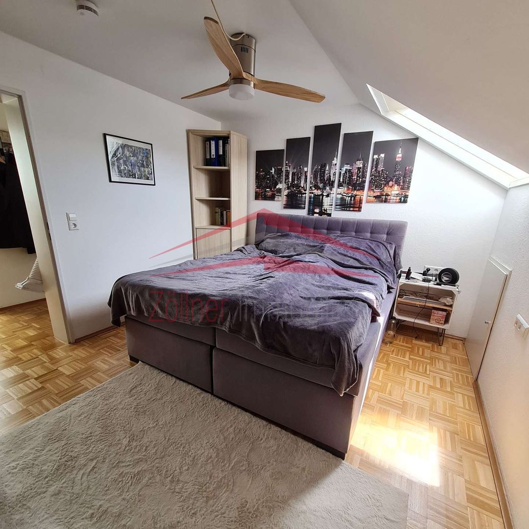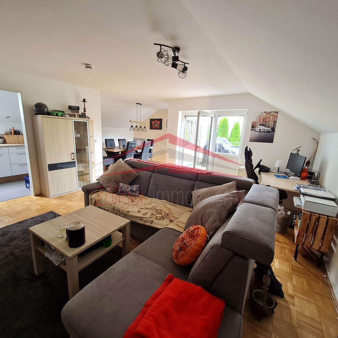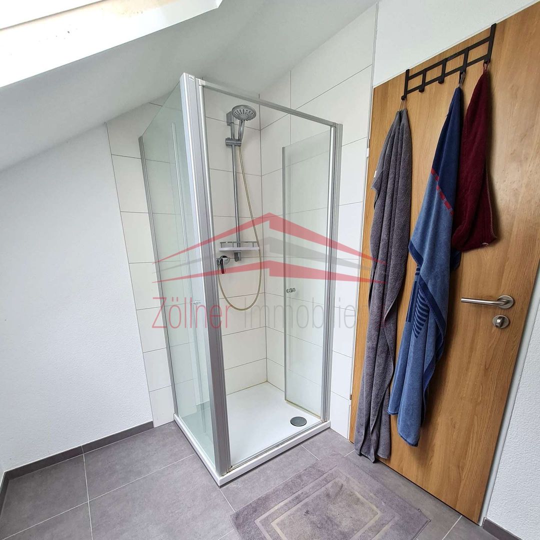 Von der Diele aus gelangt man in das große offene Wohn-Esszimmer mit Zugang zur Terrasse, von der eine herrliche Aussicht besteht. Neben dem Schlafzimmer gibt es noch eine Küche, ausgestattet mit einer Einbauküche, ein Tageslichtbad mit Dusche und ein separates WC. Trotz Dachgeschoss sind gute Stellmöglichkeiten für Möbel vorhanden, da der Kniestock relativ hoch ist. In den Schrägen sind zusätzliche Stauflächen vorhanden.
