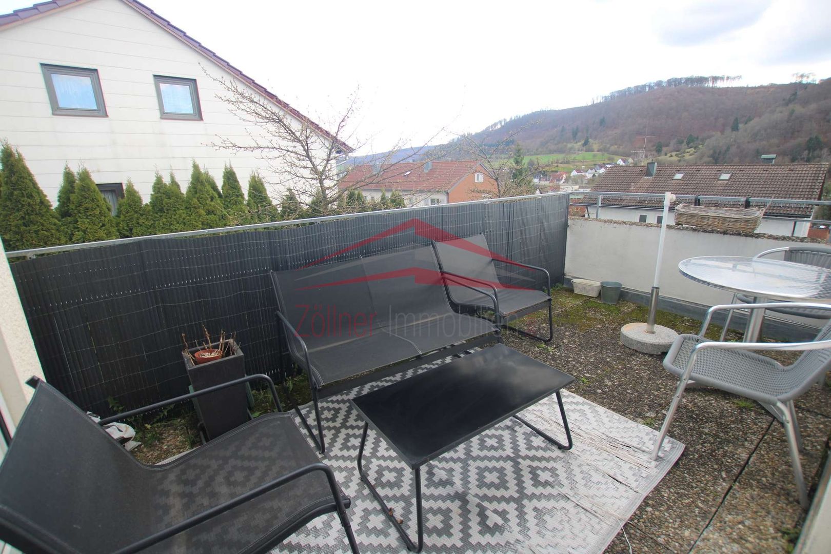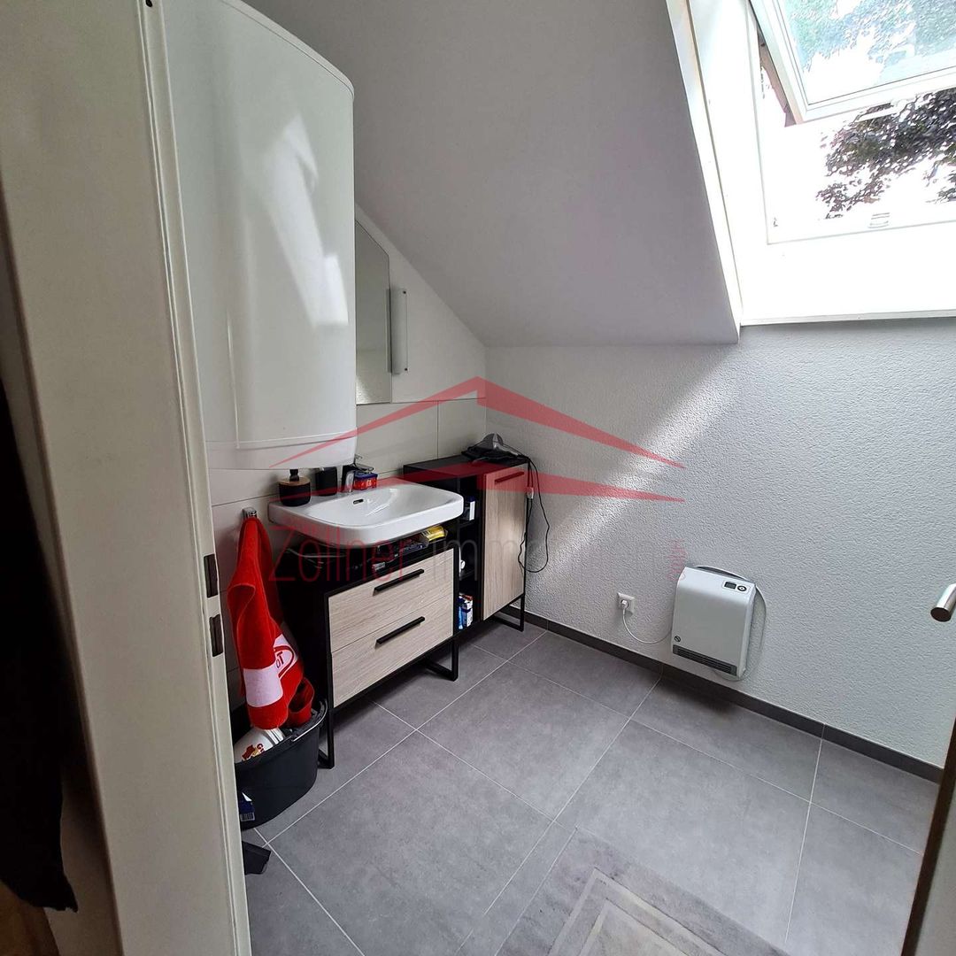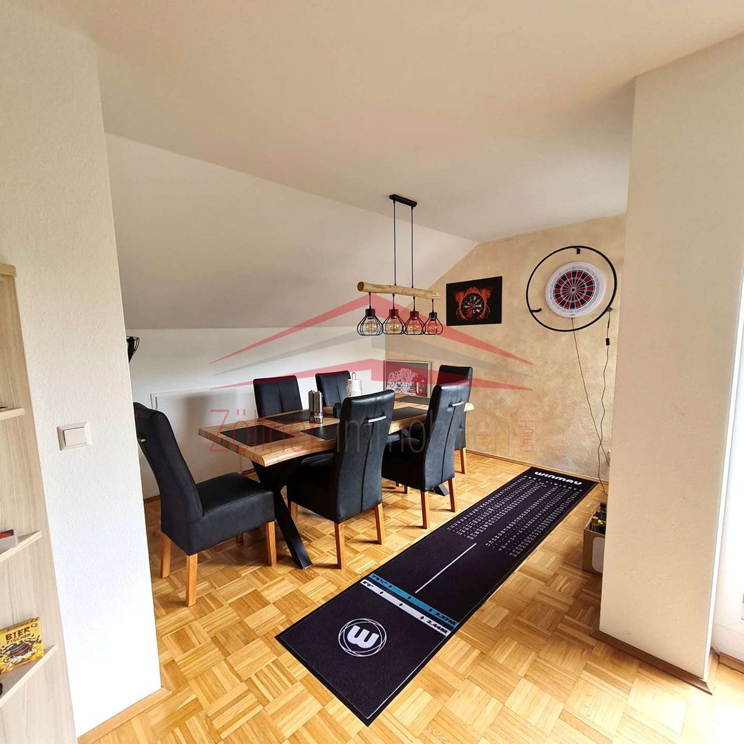 Von der Diele aus gelangt man in das große offene Wohn-Esszimmer mit Zugang zur Terrasse, von der eine herrliche Aussicht besteht. Neben dem Schlafzimmer gibt es noch eine Küche, ausgestattet mit einer Einbauküche, ein Tageslichtbad mit Dusche und ein separates WC. Trotz Dachgeschoss sind gute Stellmöglichkeiten für Möbel vorhanden, da der Kniestock relativ hoch ist. In den Schrägen sind zusätzliche Stauflächen vorhanden.