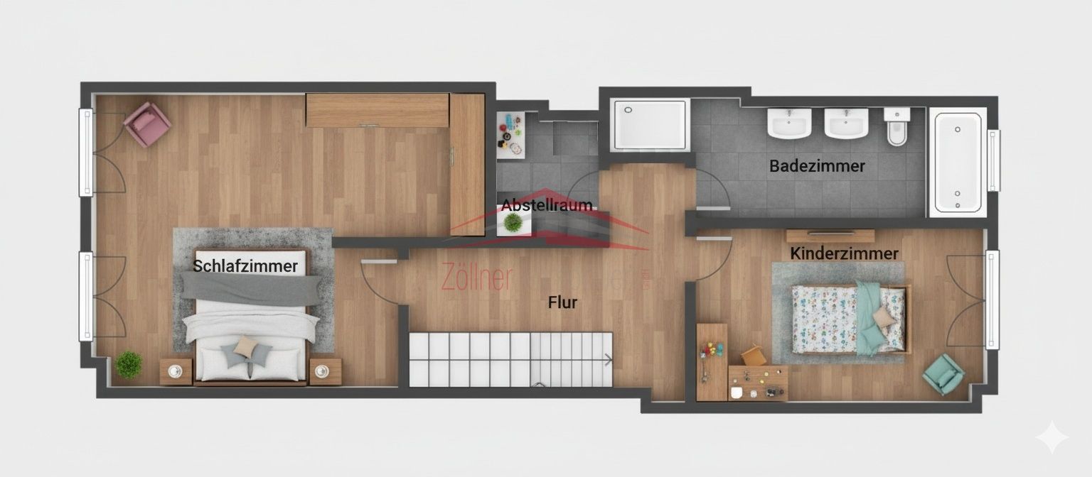 Über eine Treppe gelangt man aus dem Wohnbereich im Erdgeschoss in den Flur des Obergeschosses. Das Obergeschoss verfügt über ein großes Schlafzimmer, in das man auch eine Ankleide integrieren kann, ein weiteres Kinderzimmer, ein großes Tageslichtbad, das mit einer Badewanne, einer Dusche, zwei Waschbecken und einem WC ausgestattet ist und einen kleinen Abstellraum. Die Schlafräume haben bodentiefe Fenster für eine helle und freundliche Atmosphäre.